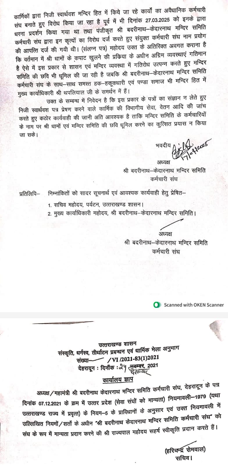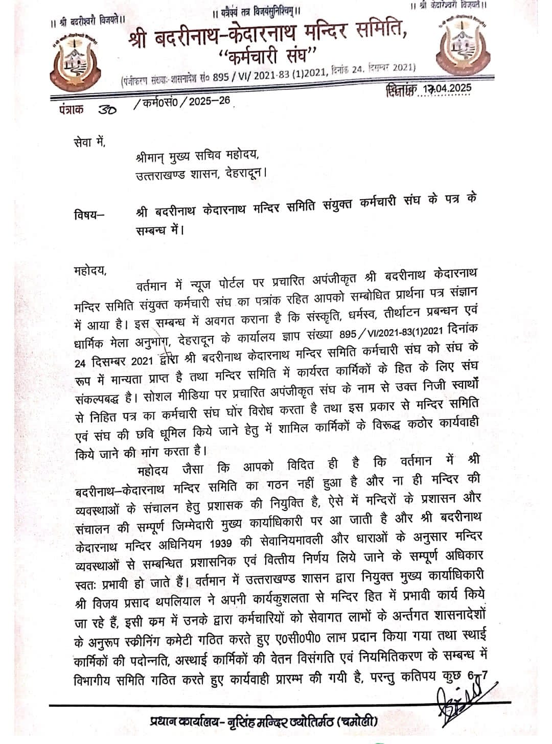 श्री बदरीनाथ केदारनाथ मन्दिर समिति संयुक्त कर्मचारी संघ की ओर से अध्यक्ष विजेंद्र बिष्ट ने मुख्य सचिव को संबोधित पत्र में बताया कि मंदिर समिति संयुक्त कर्मचारी संघ के नाम से मुख्य सचिव को प्रार्थना पत्र भेजा गया है जिसमें मुख्य कार्याधिकारी पर गलत आक्षेप लगाये गये है।