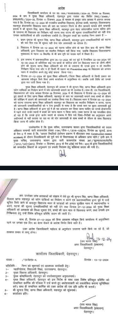 सहसपुर में स्कूल की छत गिरने की घटनाः बच्चों के जानमाल से खिलवाड़़ एवं मिथ्या सूचना देने पर डीएम ने खण्ड शिक्षा अधिकारी सहसपुर का 1 दिन का वेतन रोकने के साथ ही दी विशेष प्रतिकूल प्रविष्टि