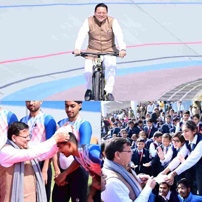 देहरादून। रुद्रपुर ,मुख्यमंत्री ने गुरुवार को मनोज सरकार स्पोर्टस स्टेडियम में 38वें राष्ट्रीय खेलों के अन्तर्गत शिवालिक वेलोड्रम मे टैक साइकिलिंग प्रतियोगिता को दर्शक दीर्घा से देखा। उन्होंने वेलोड्रम पहुंचकर खिलाड़ियो से परिचय प्राप्त कर टैक पर साइकिलिंग भी की। इसके बाद मुख्यमंत्री ने पुरूष वर्ग के टीम परस्यूट डिस्टेंस 4000 मीटर प्रतियोगिता में स्वर्ण पदक विजेता सर्विसेज स्पोर्टस कंट्रोल बोर्ड, रजत पदक विजेता पंजाब व कांस्य पदक विजेता राजस्थान को मैडल व पहाड़ी टोपी पहनाकर सम्मानित किया। इसके उपरान्त मुख्यमंत्री ने खिलाड़ियों के साथ भोजन किया व खिलाड़ियों के लिए की गई व्यवस्थाओं के बारे में खिलाड़ियों से जानकारी ली जिस पर खिलाड़ियो ने सभी प्रकार की व्यवस्थाओं पर प्रसन्नता व्यक्त की।