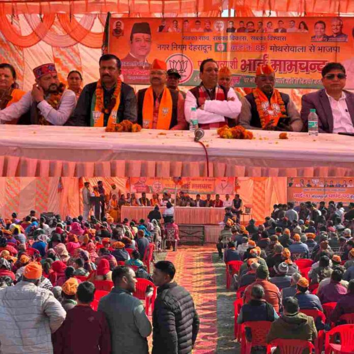Dehradun। सबका साथ सबका विकास* मंत्र को लेकर धर्मपुर विधानसभा के विधायक विनोद चमोली के नेतृत्व में भाजपा मेयर प्रत्याशी सौरभ थपलियाल के द्वारा वार्ड 82 के प्रत्याशी के दिनेश सती के लिए जनसंपर्क वार्ड 85 मोथरावाला में प्रत्याशी मामचंद के यहां बड़ी संख्या में जनसभा आयोजित की गई।