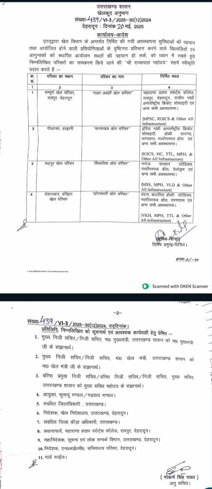 खेल मंत्री रेखा आर्या ने बताया कि रजत जयंती खेल परिसर में रायपुर देहरादून स्थित महाराणा प्रताप स्पोर्ट्स कॉलेज, राजीव गांधी इंटरनेशनल क्रिकेट स्टेडियम और अन्य सभी खेल अवस्थापनाएं शामिल होंगी। इसी तरह गौलापार हल्द्वानी स्थित इंदिरा गांधी इंटरनेशनल क्रिकेट स्टेडियम, हॉकी ग्राउंड, तरण ताल, मल्टीपरपज हॉल व अन्य सभी खेल अवस्थनाओं को मिलाकर अब मानसखंड खेल परिसर के नाम से जाना जाएगा।