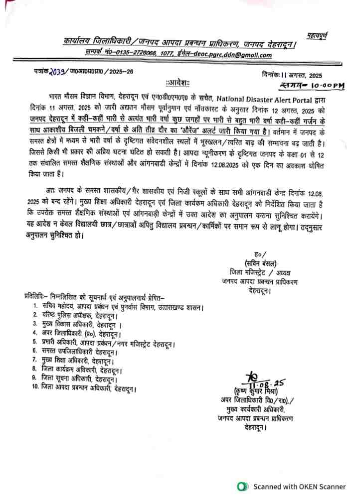 देहरादून में 12 अगस्त को भी स्कूल रहेंगे बंद देखिए आदेश