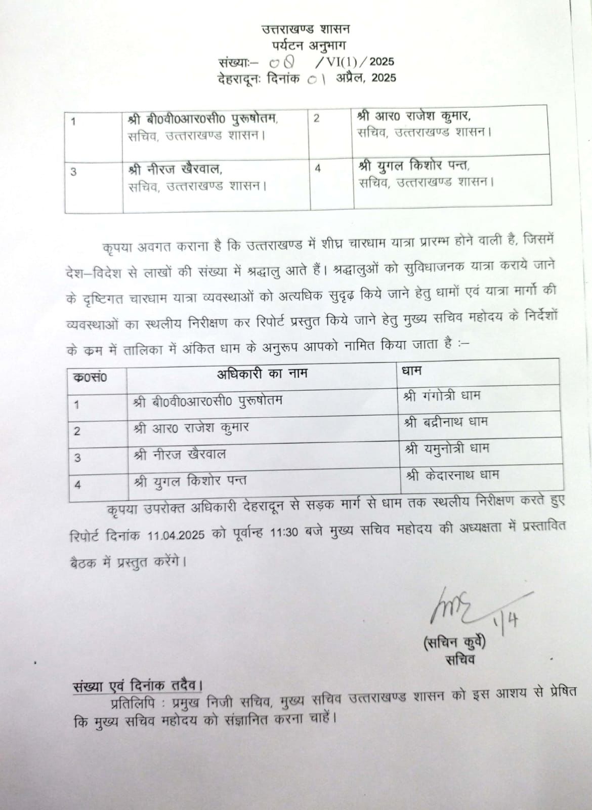 देहरादून। चार धाम यात्रा 30 अप्रैल से शुरू होने वाली है इसी के दृष्टिगत चारों धामों के के लिए एक-एक सचिव को नियुक्त किया गया है जो की सड़क मार्ग से स्थलीय निरीक्षण कर अपनी रिपोर्ट मुख्य सचिव को सौंपेगे।