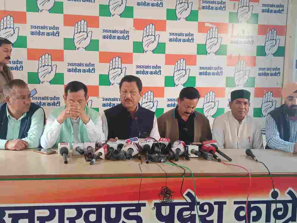 पत्रकार वार्ता में कांग्रेस प्रदेश उपाध्यक्ष सूर्यकांत धस्माना प्रदेश प्रवक्ता शीशपाल सिंह बिष्ट महानगर अध्यक्ष जसविंदर सिंह गोगी प्रदेश महामंत्री नवीन जोशी और महेंद्र सिंह नेगी गुरुजी उपस्थित रहे ।