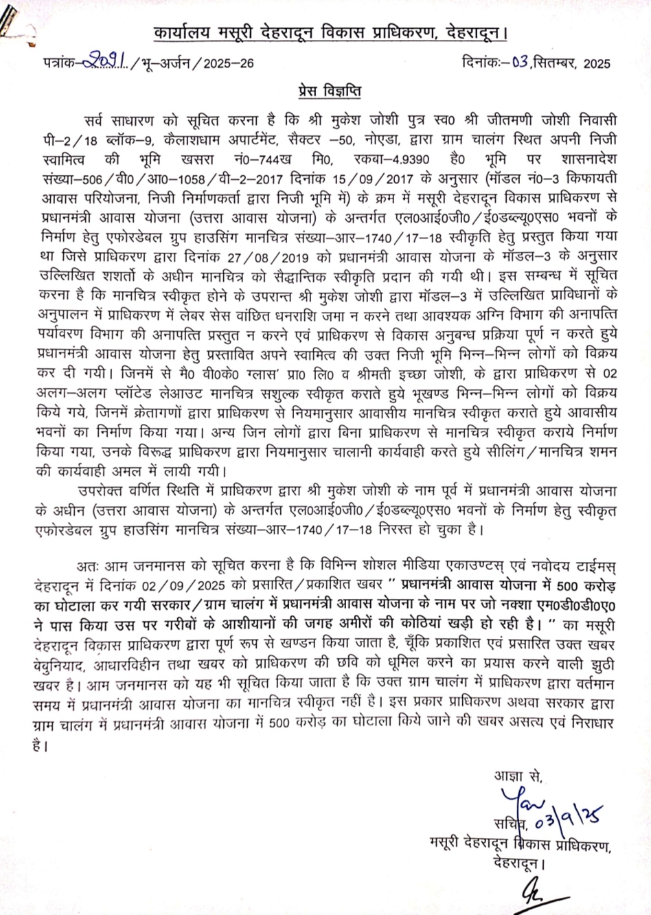 एमडीडीए सचिव मोहन सिंह बर्निया ने कहा निजी भू-स्वामी मुकेश जोशी द्वारा ग्राम चालंग क्षेत्र में निजी भूमि पर प्रधानमंत्री आवास योजना (हाउसिंग फॉर ऑल) के अंतर्गत एक प्रस्ताव प्रस्तुत किया गया था। इस प्रस्ताव पर 2017 से लेकर 2019 तक विभिन्न स्तरों पर प्रक्रिया चली, लेकिन अंततः राज्य सरकार द्वारा इसे मान्यता प्रदान नहीं की गई। प्राधिकरण का कहना है कि उक्त प्रस्ताव मात्र एक निजी हाउसिंग मॉडल था, जिसे प्रधानमंत्री आवास योजना का स्वरूप देकर प्रस्तुत करने का प्रयास किया गया। लेकिन शासन स्तर पर इसकी कोई स्वीकृति नहीं मिली। इसके बावजूद हाल ही में कुछ मीडिया संस्थानों और सोशल मीडिया प्लेटफॉर्म पर यह खबर प्रसारित की गई कि “ग्राम चालंग में प्रधानमंत्री आवास योजना के नाम पर 500 करोड़ का घोटाला हुआ है”।